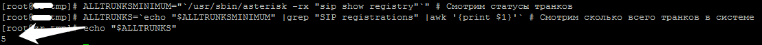#!/bin/bash  # Задаем переменные  ALLTRUNKSMINIMUM="`/usr/sbin/asterisk -rx "sip show registry"`" # Смотрим статусы транков  ALLTRUNKS=`echo "$ALLTRUNKSMINIMUM" |grep "SIP registrations" |awk '{print $1}'` # Смотрим сколько всего транков в системе  REGTRUNKS=`/usr/sbin/asterisk -rx "sip show registry" |grep Registered |wc -l` # Зарегистрированные  транки (все транки со статусом Registered)  # Задаем условие  if [ "$REGTRUNKS" -lt "$ALLTRUNKS" ]; then # Если есть хоть один проблемный транк (В одном или более транке встретился статус отличный от Registered) то  sleep 5 # Ждем 5 секунд  echo `/usr/sbin/asterisk -rx "sip reload"` # Делаем sip reload  sleep 5 # Ждем 5 секунд  VAR=`/usr/sbin/asterisk -rx "sip show registry"` # Смотрим статусы транков после проверки  # Уведомляем на почту о том какие статусы стали после проверки  echo "$VAR" | mail -s "Мониторинг транков" your@mail.ru  # Если условие ложно (т.е. с  транками все хорошо)  else  echo “ALL STATUS OK” # Просто выводим что со всеми статусами все хорошо и ничего не делаем больше  fi