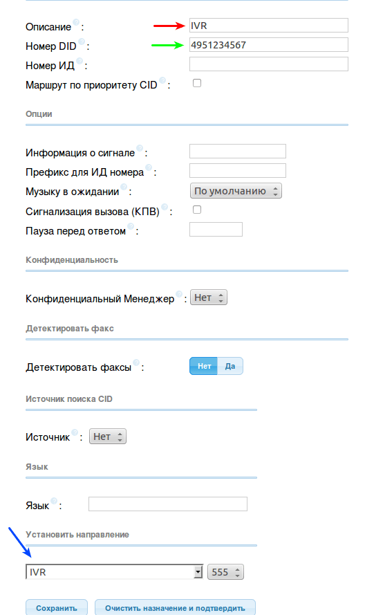 Разберем пример, показанный на скриншоте: красной стрелочкой указано название нашего маршрута (IVR), зеленой — наш номер (4951234567) и синей — направление обработки звонка, в данном случае звонок будет попадать в IVR с названием 555.