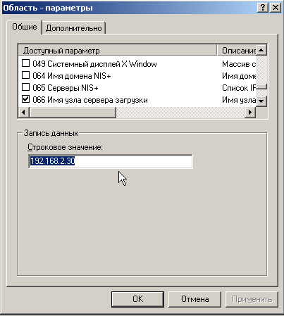 - В открывшемся окне выбираем опцию 66 Имя узла сервера загрузки (отмечаем галочкой) и прописываем ip-адрес TFTP-сервера в поле строковое значение. Нажимаем Применить>ОК