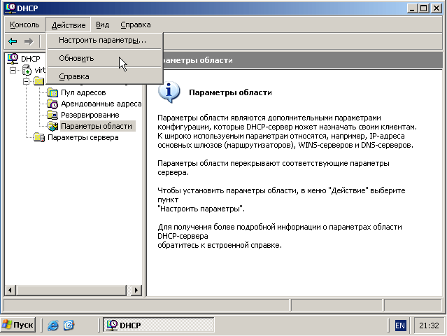- Выбираем Параметры области активного DHCP-сервера, далее Действие>Настроить параметры