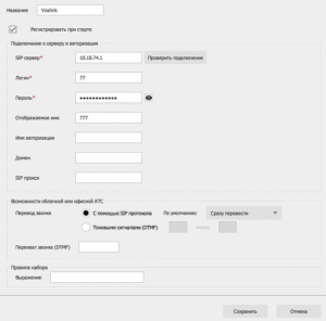 Регистрировать при старте — если стоит галочка, то приложение выполнит SIP-регистрацию аккаунта при старте. Если галочки нет, то вы не сможете принимать входящие звонки.
