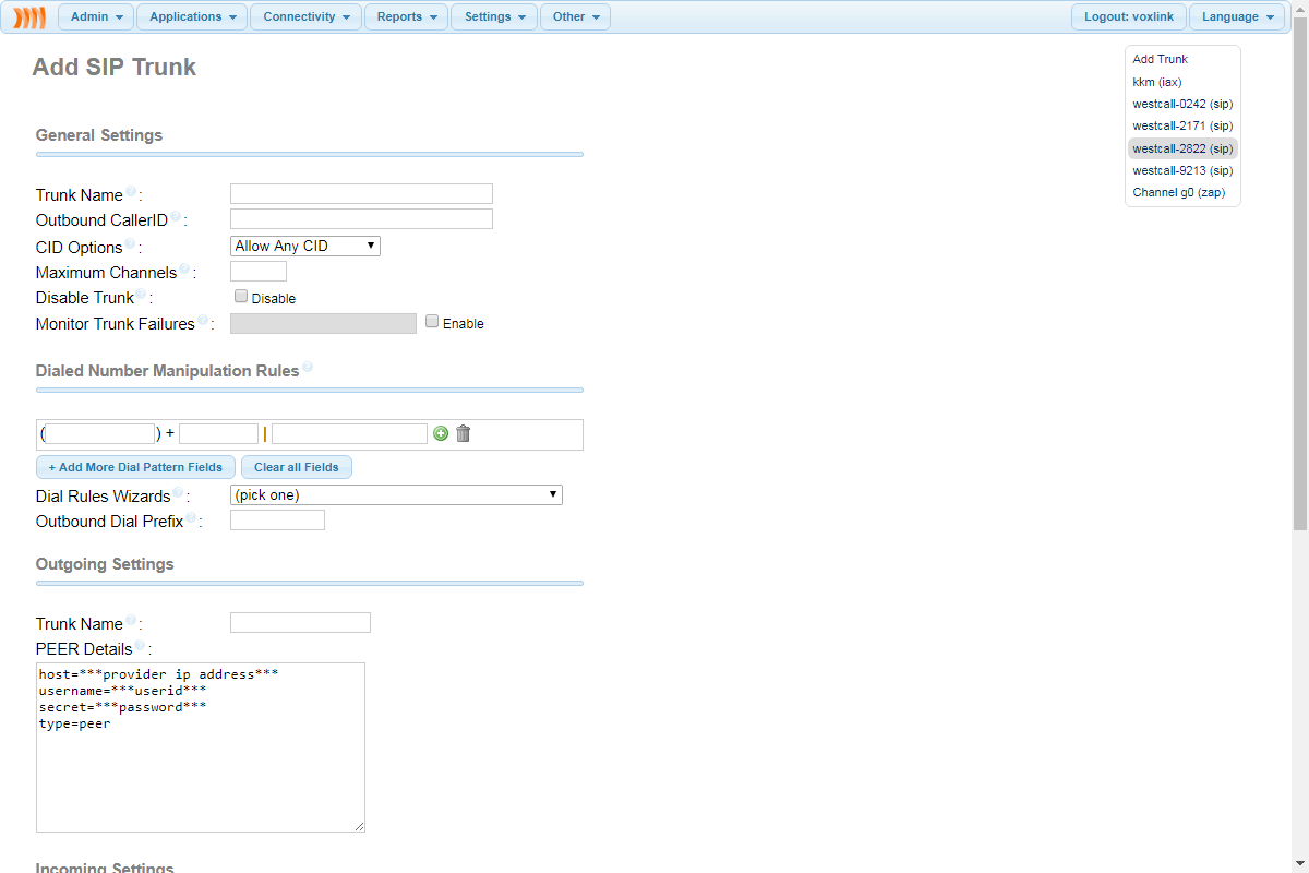 Настройки будет проводить через web-интерфейс FreePBX. Тем не менее, он имеет мало отличий от, к примеру, web-интерфейса Elastix и данная статья, несмотря на ряд отличий в интерфейсе подойдет и для настройки транка через Elastix и любого другого форка FreePBX.